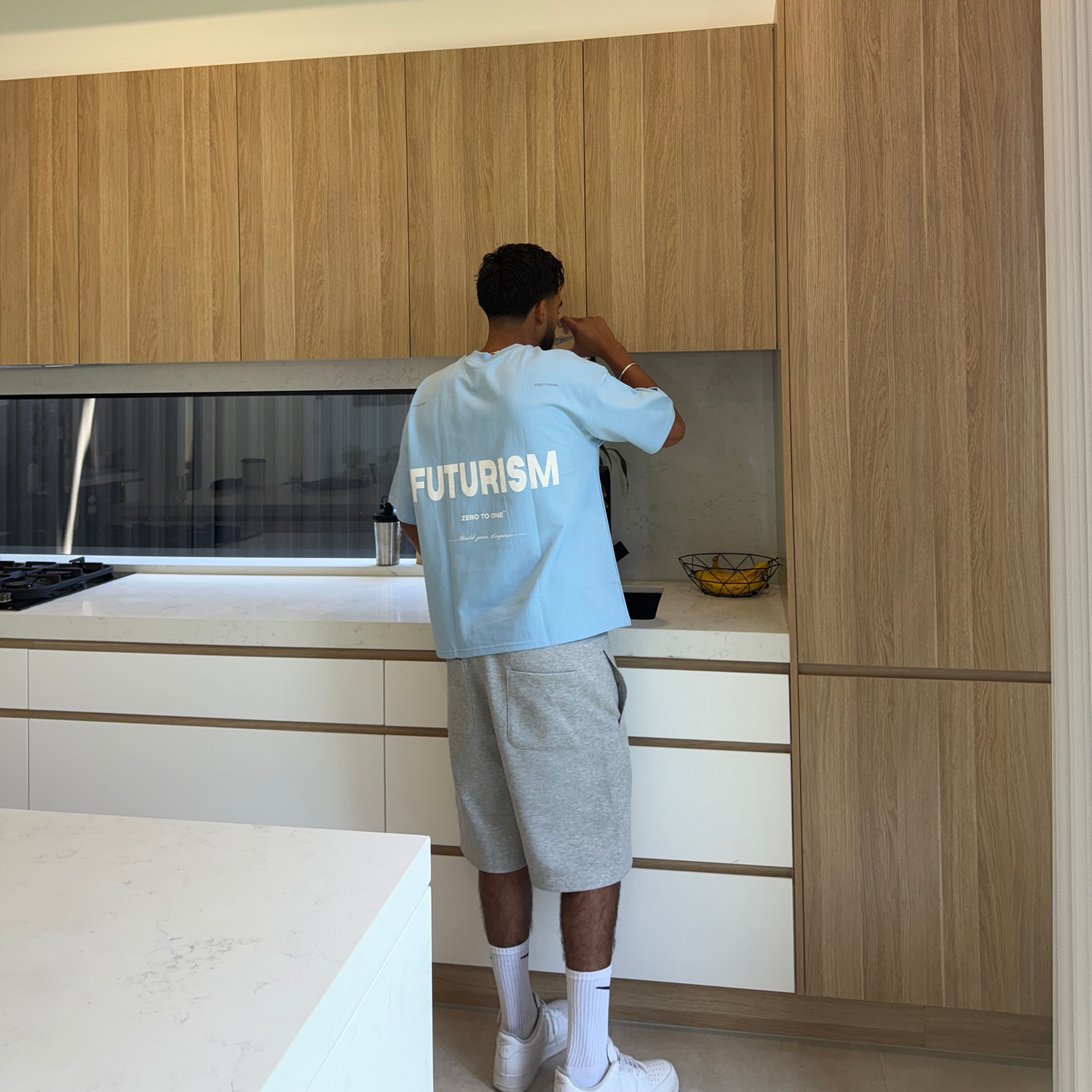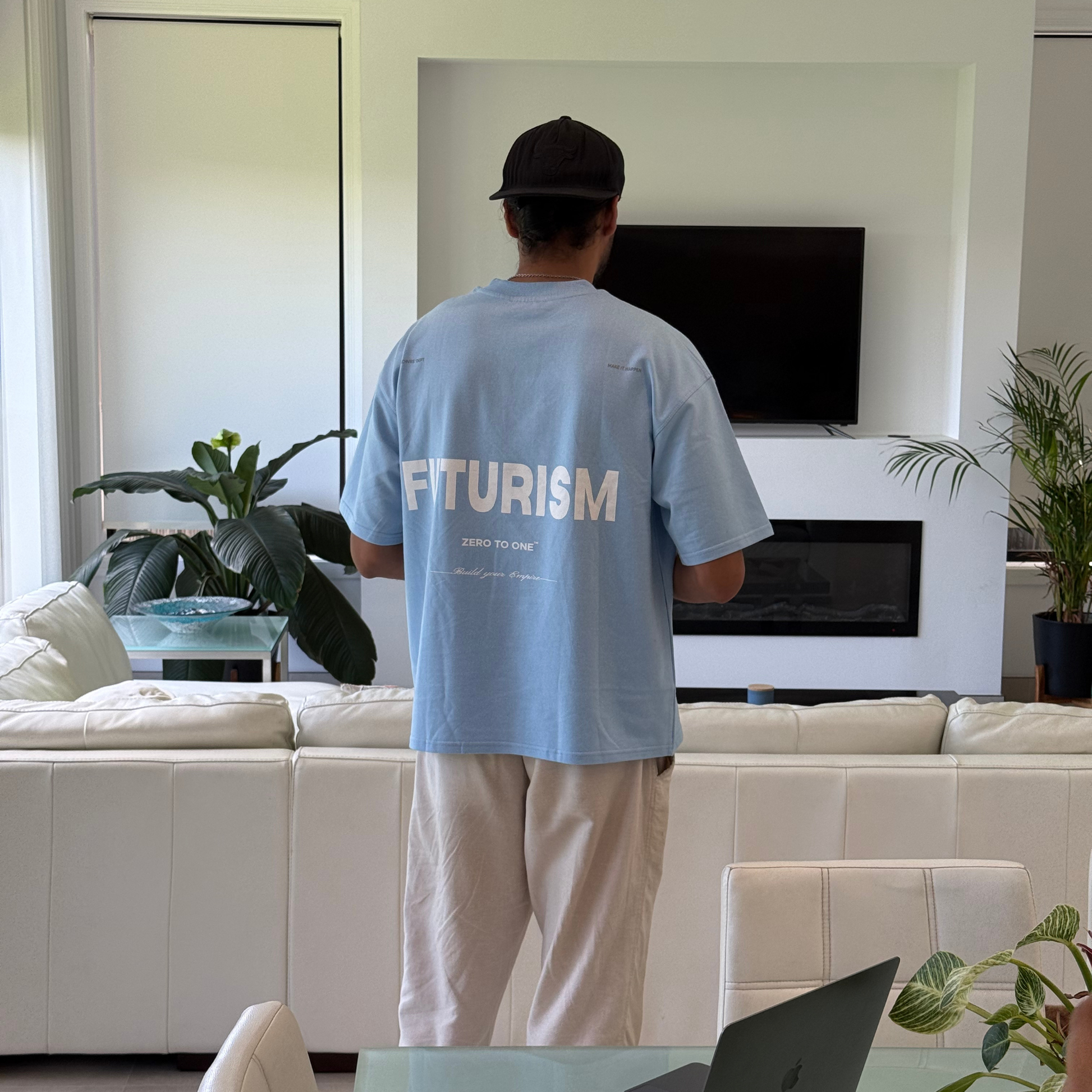 The University Blue Futurism T-Shirt is a bold addition to your wardrobe. Crafted from 240 GSM, 100% cotton terry fabric, this oversized t-shirt offers a comfortable, boxy fit. Featuring a unique Futurism graphic on the back, this graphic tee for men is screen printed by hand, making it a one-of-a-kind piece.